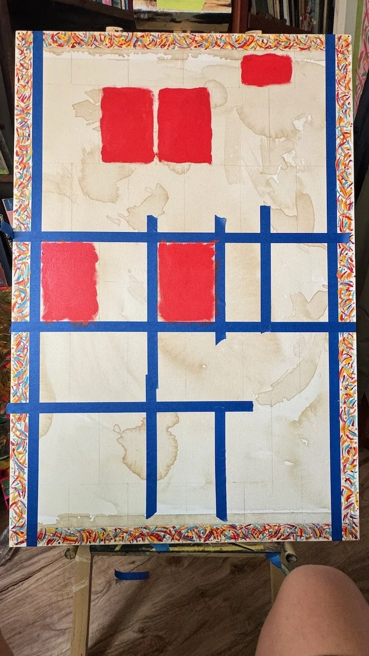 "Suerte" is inspired by the vibrant, weathered tiles of Mediterranean walls, with bold colors and textures that evoke time's passage. The piece features heavy cardstock tiles with moss, grass, and dirt emerging from them. At the center, a horseshoe symbolizes luck, while also representing a "good riddance" farewell, a phrase used in Colombia to bid goodbye to the past. Painted with meticulous brushstrokes, the work draws on the rich turquoise, red, and orange hues of the Mediterranean, marking a colorful end to what has been.